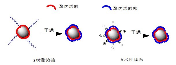 HT A20分子中的錨固部分由(甲基)丙烯酸、磷酸的均聚物或共聚物組成,通過和鈦白粉間的吸引力(配位作用、共價(jià)鍵)吸附在粒子表面,將粒子隔離開來。和樹脂相容的穩(wěn)定部分由丙烯酸酯、甲氧基聚丙二醇丙烯酸酯無規(guī)共聚物組成,賦予表面改性后的鈦白粉粒子良好的再分散性,并且能穩(wěn)定均勻分散在樹脂溶液和溶劑揮發(fā)后的樹脂中。在體系干燥過程中以及干燥后,和樹脂相容的部分能包覆在鈦白粉粒子表面,防止粒子聚集,使得鈦白粉粒子在樹脂中能均勻分散。圖2表示改性劑HT A20處理鈦白粉粒子后,HT A20在粒子表面的形態(tài)。圖2a表示在樹脂溶液或溶劑中,干燥前,改性劑的錨固部分和鈦白粉粒子間通過共價(jià)鍵、配位鍵結(jié)合在粒子表面上,聚丙烯酸酯部分充分伸展,通過空間位阻作用穩(wěn)定粒子;干燥后,聚丙烯酸酯部分包覆在粒子上或和樹脂基體互相滲透。圖2b表示在水性體系中,干燥前,改性劑的聚丙烯酸錨固部分和鈦白粉粒子間通過共價(jià)鍵、配位鍵結(jié)合在粒子表面上,依靠靜電斥力穩(wěn)定粒子;干燥后,聚丙烯酸酯部分包覆在粒子上或和樹脂互相滲透。可見,雙親型嵌段聚合物改性劑HT A20對鈦白粉進(jìn)行有機(jī)表面處理后,在有機(jī)溶劑體系和水性體系中,都能提高鈦白粉在介質(zhì)中的分散穩(wěn)定性并改善鈦白粉和樹脂的相容性。